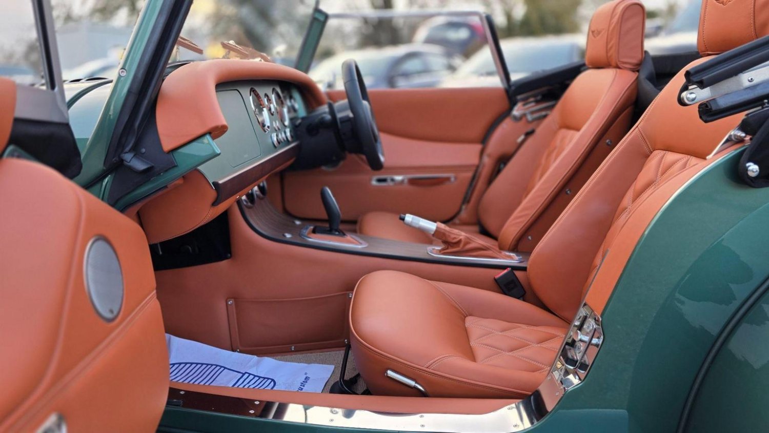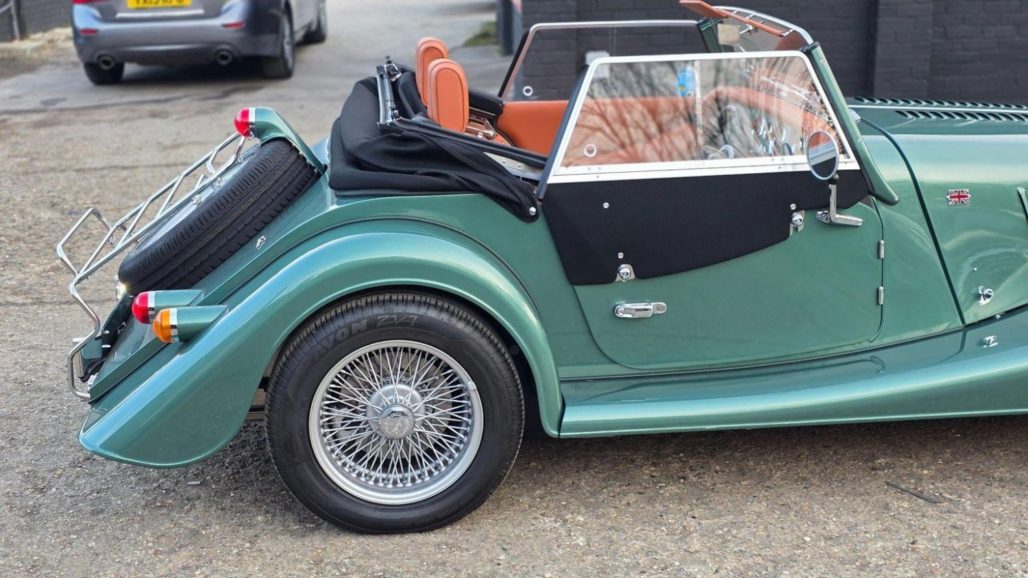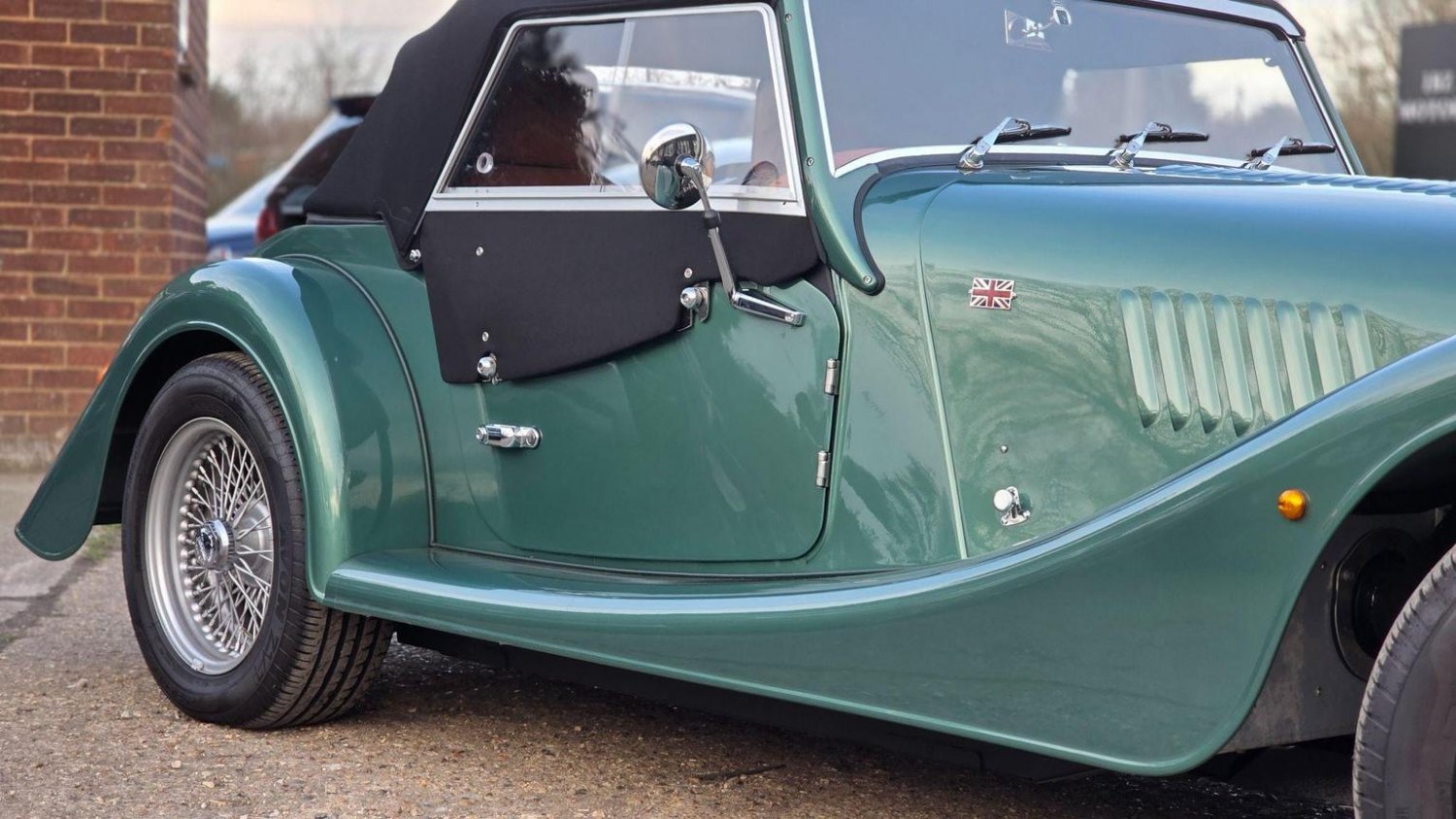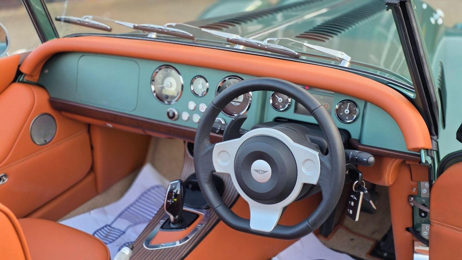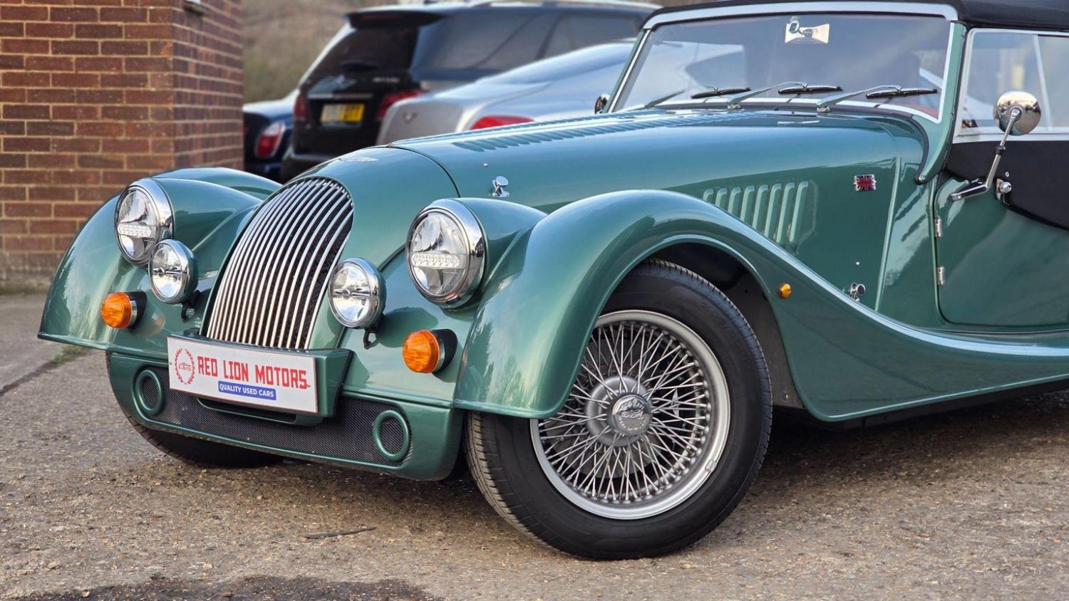 Heated Seats, Stitching - Contrast Colour - Biscuit, Sun Visors, Steering Wheel Centre - Black, Soft Grain Leather - Rich Tan, Dashboard Textile - Matte Finish - Veneer Brown Velvet, Speaker System with Bluetooth Input and Volume Control, Puddle Lights, 15in Wire Wheels - Painted Silver - Four-Wheel Vehicle, 15in Wire Wheels - Painted Silver - Five-Wheel Vehicle, Black Grille Mesh, Bonnet Badges - Union Jack Coloured, Easy-up Hood - Green Mohair, Wing Beading - Green, Air Conditioning, Box Weave Carpet - Biscuit, Centre Column Top - Leather Wrapped - Matched to Main Leather Colour, Extended Leather Interior, Head Rest Embroidery - Morgan Wings Logo