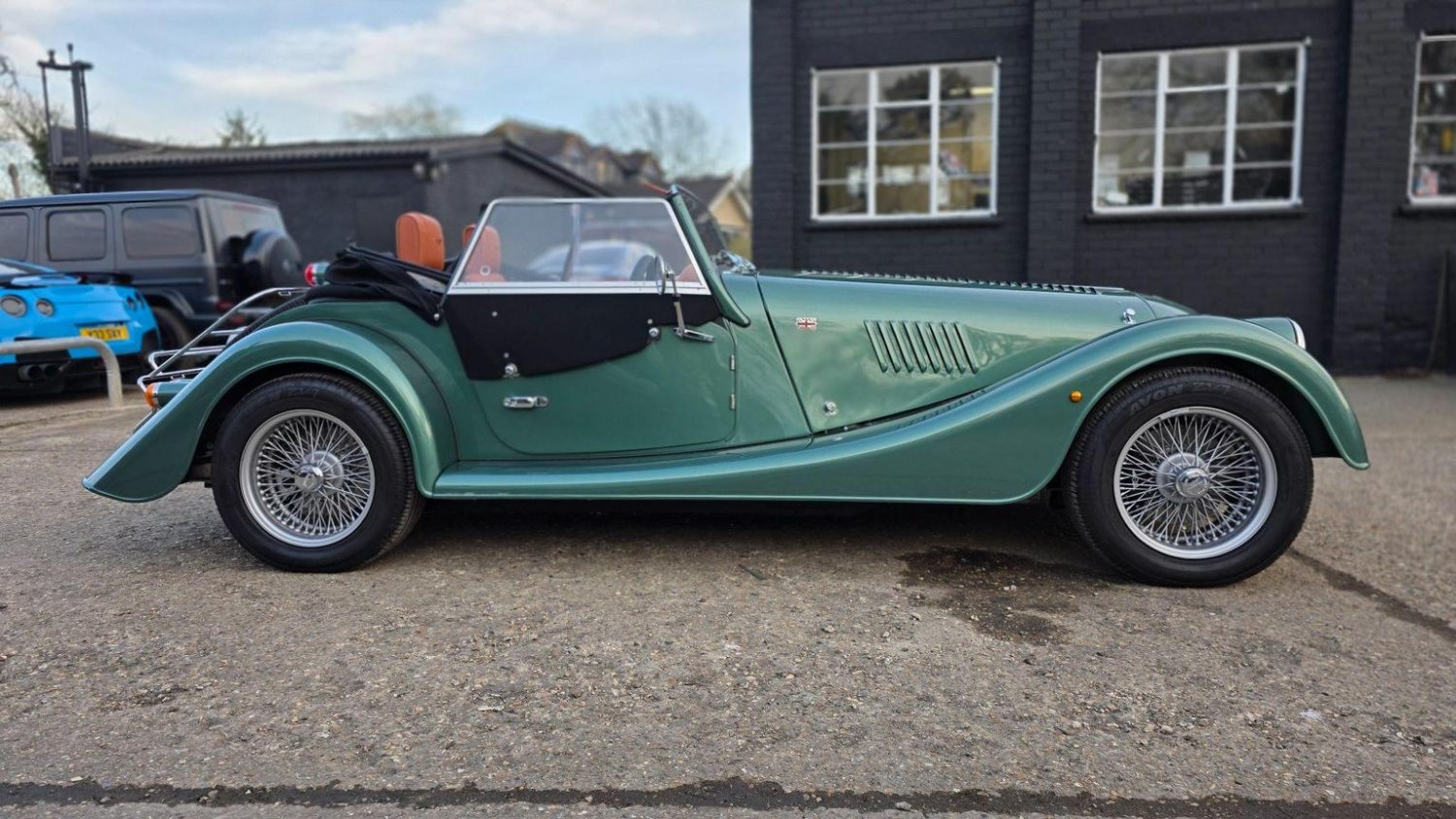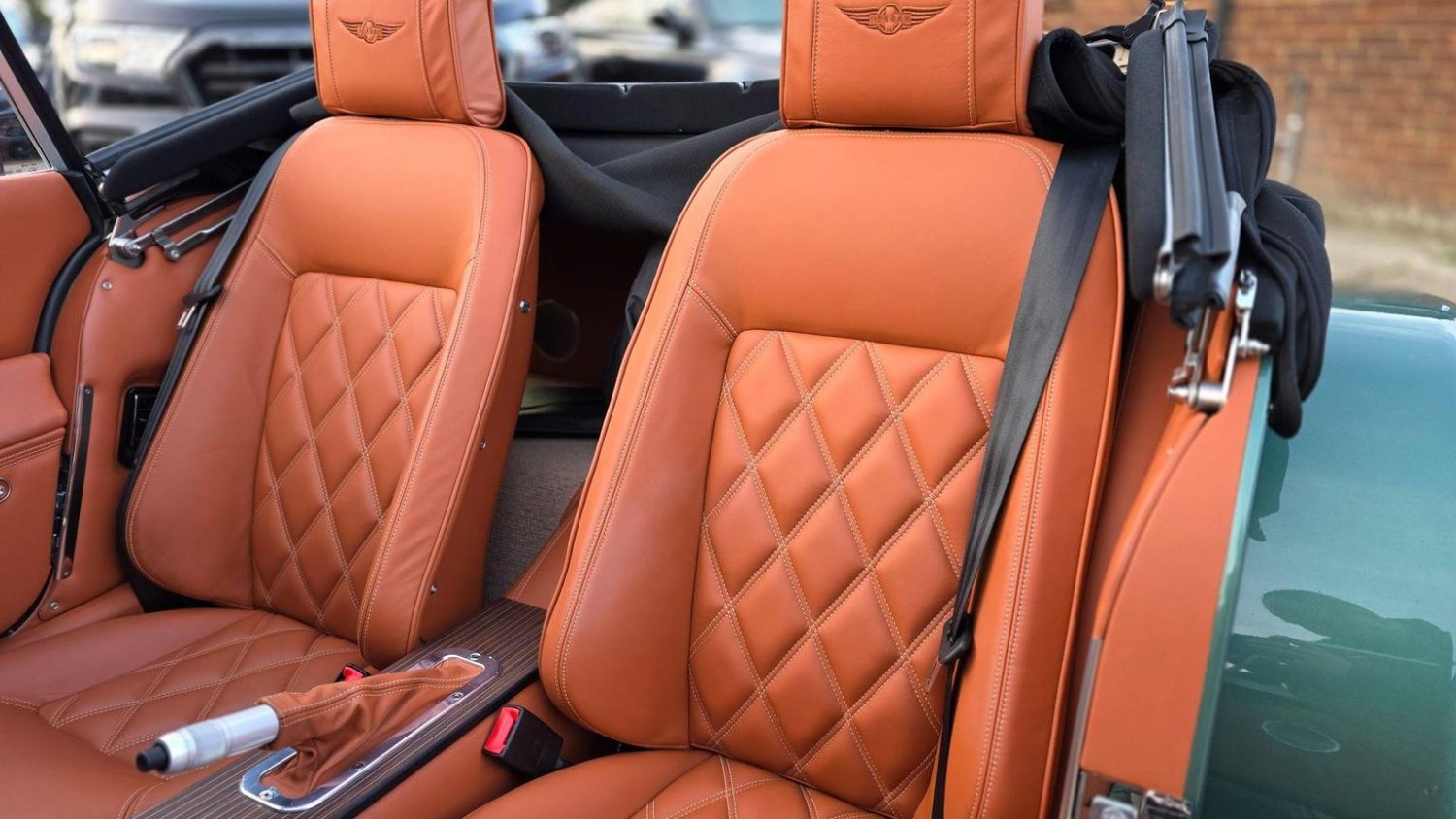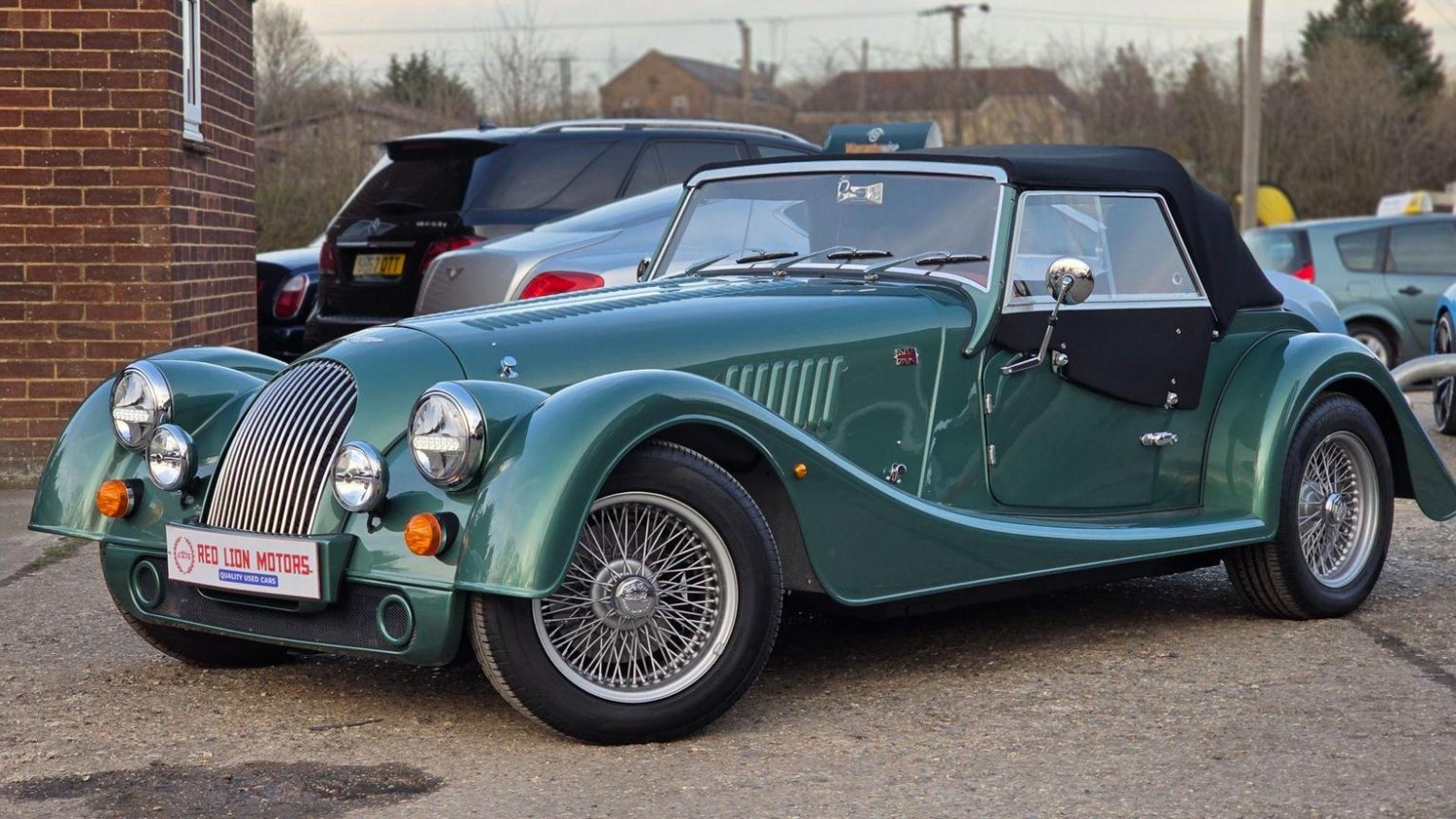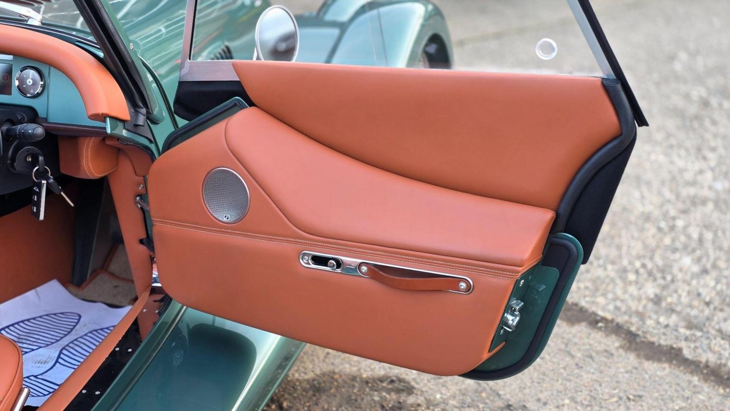 Heated Seats, Stitching - Contrast Colour - Biscuit, Sun Visors, Steering Wheel Centre - Black, Soft Grain Leather - Rich Tan, Dashboard Textile - Matte Finish - Veneer Brown Velvet, Speaker System with Bluetooth Input and Volume Control, Puddle Lights, 15in Wire Wheels - Painted Silver - Four-Wheel Vehicle, 15in Wire Wheels - Painted Silver - Five-Wheel Vehicle, Black Grille Mesh, Bonnet Badges - Union Jack Coloured, Easy-up Hood - Green Mohair, Wing Beading - Green, Air Conditioning, Box Weave Carpet - Biscuit, Centre Column Top - Leather Wrapped - Matched to Main Leather Colour, Extended Leather Interior, Head Rest Embroidery - Morgan Wings Logo